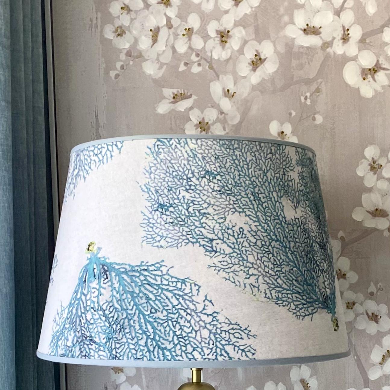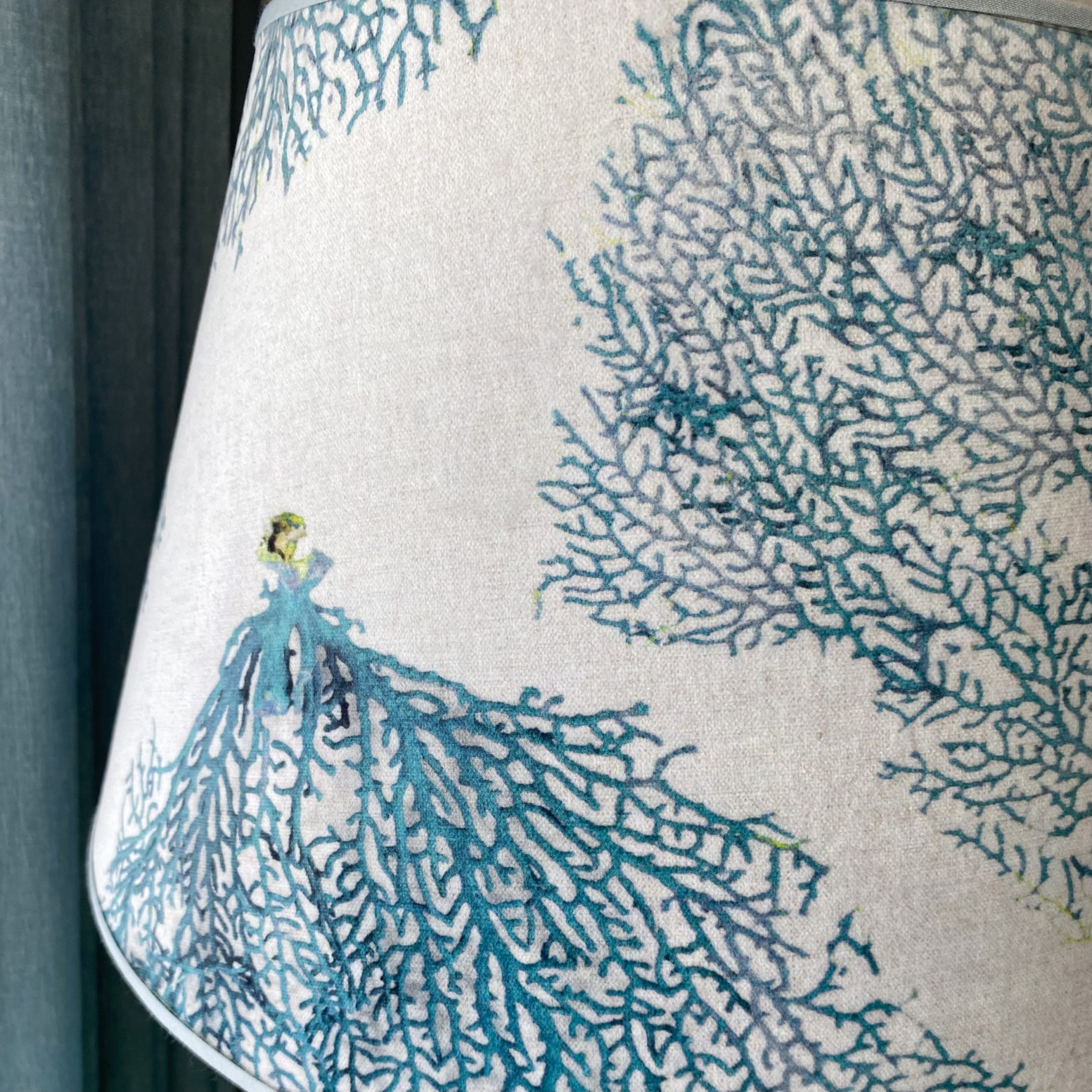 Esta pantalla es una pieza realmente especial. Su tacto suave, propio del terciopelo, se combina con un elegante estampado de corales en tonos turquesa y gris que aporta profundidad y estilo. Su interior dorado irradia una calidez envolvente que realza la iluminación, creando una atmósfera especialmente agradable. Puedes personalizarla eligiendo el color de filo que mejor se adapte a tu estilo.