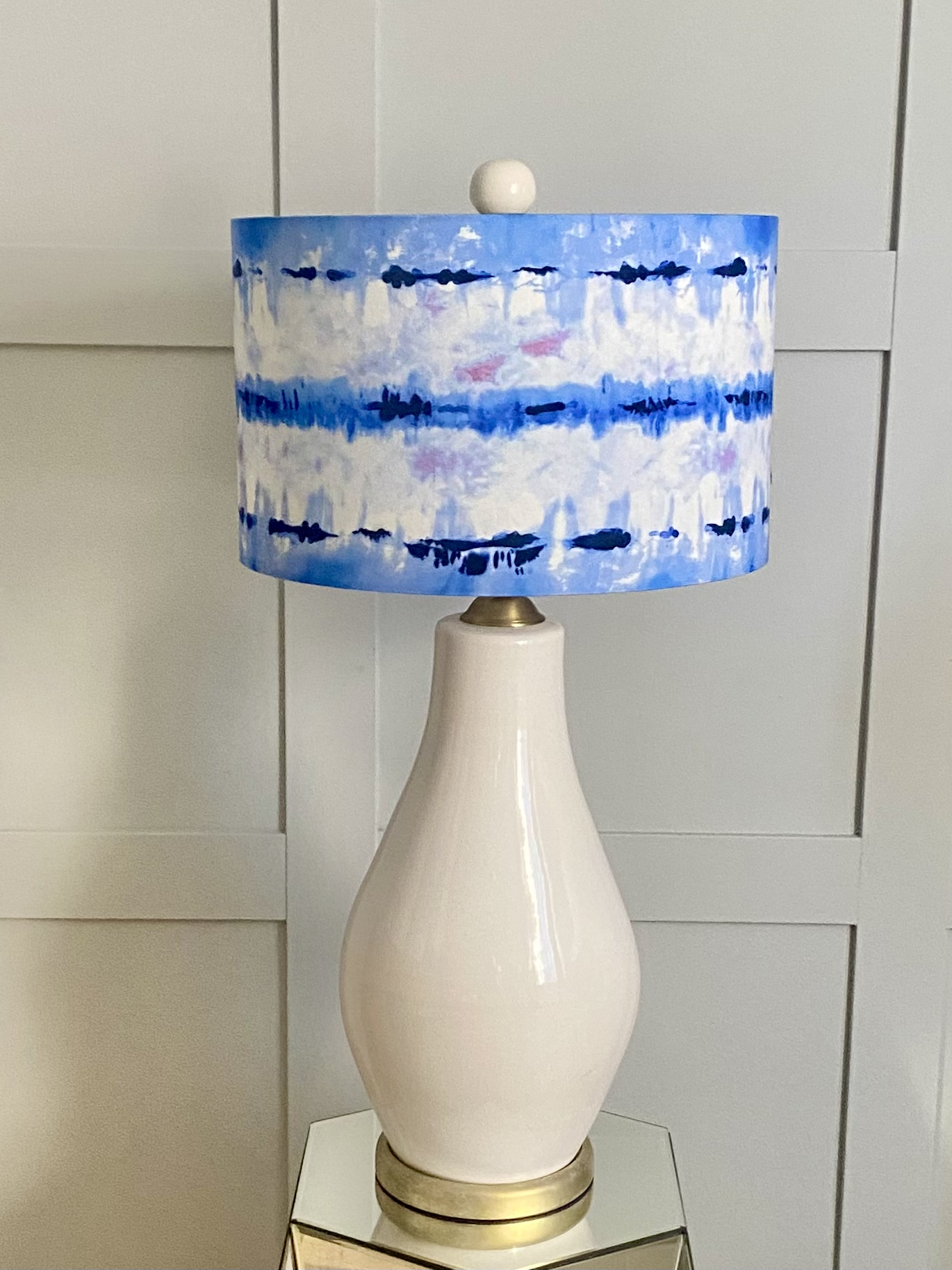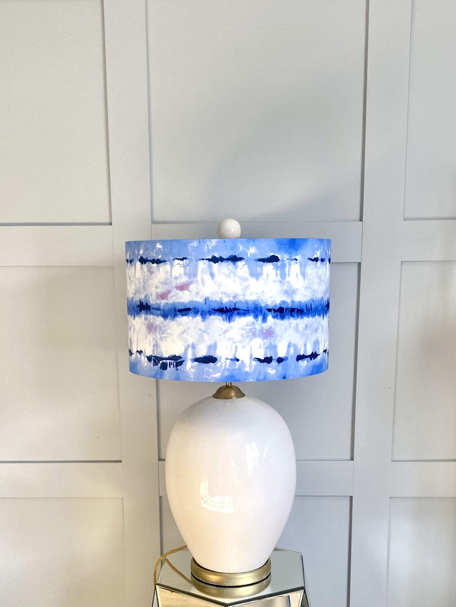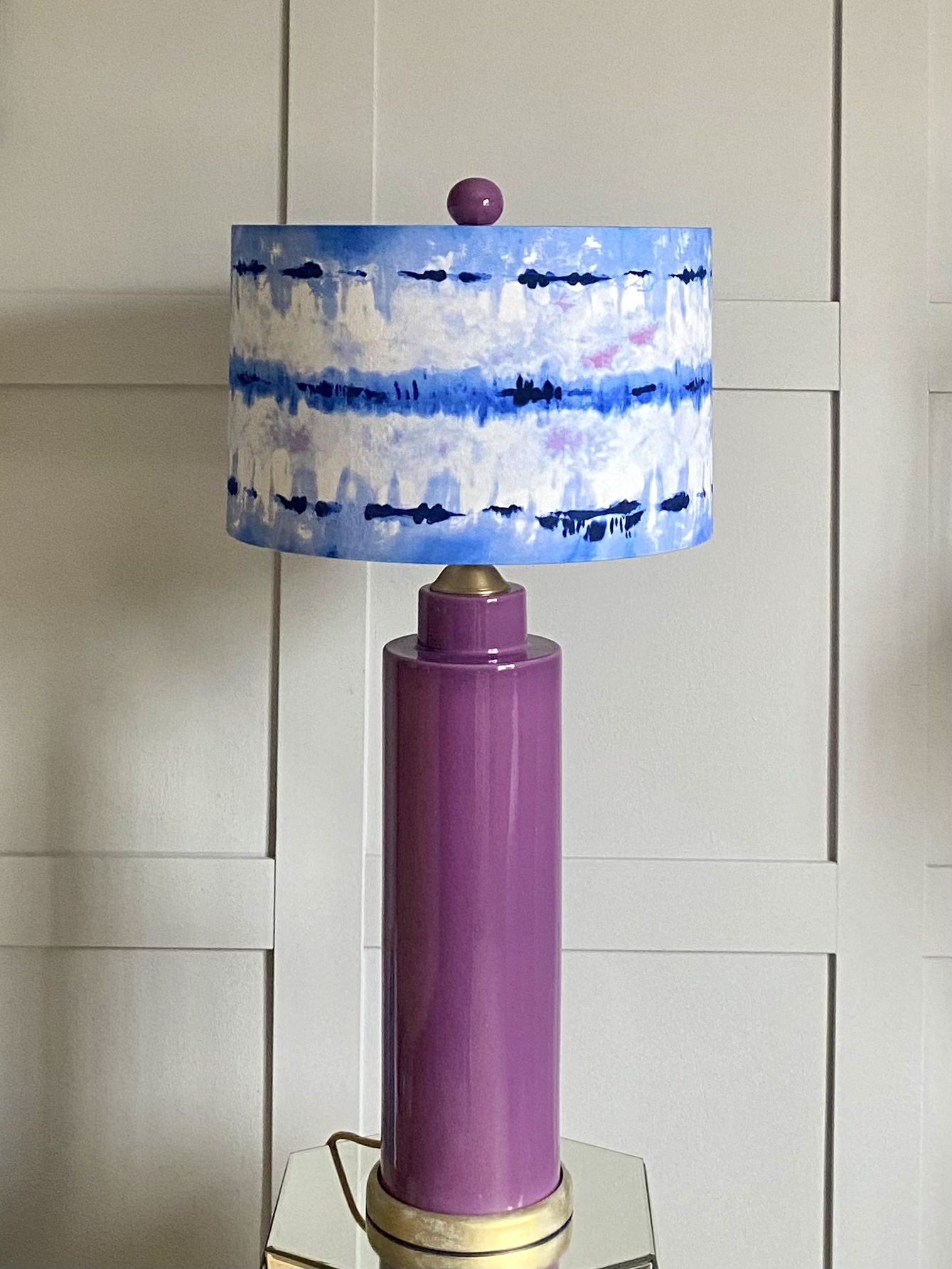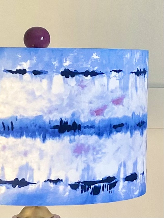 La pantalla Degradé deslumbra con su fusión de azules y suaves matices de morado. Una combinación que transmite serenidad y elegancia. Su estampado, único y armonioso se ve realzado al combinarlo con bases blancas o moradas. Es una pieza de belleza sutil capaz de transformar cualquier espacio.