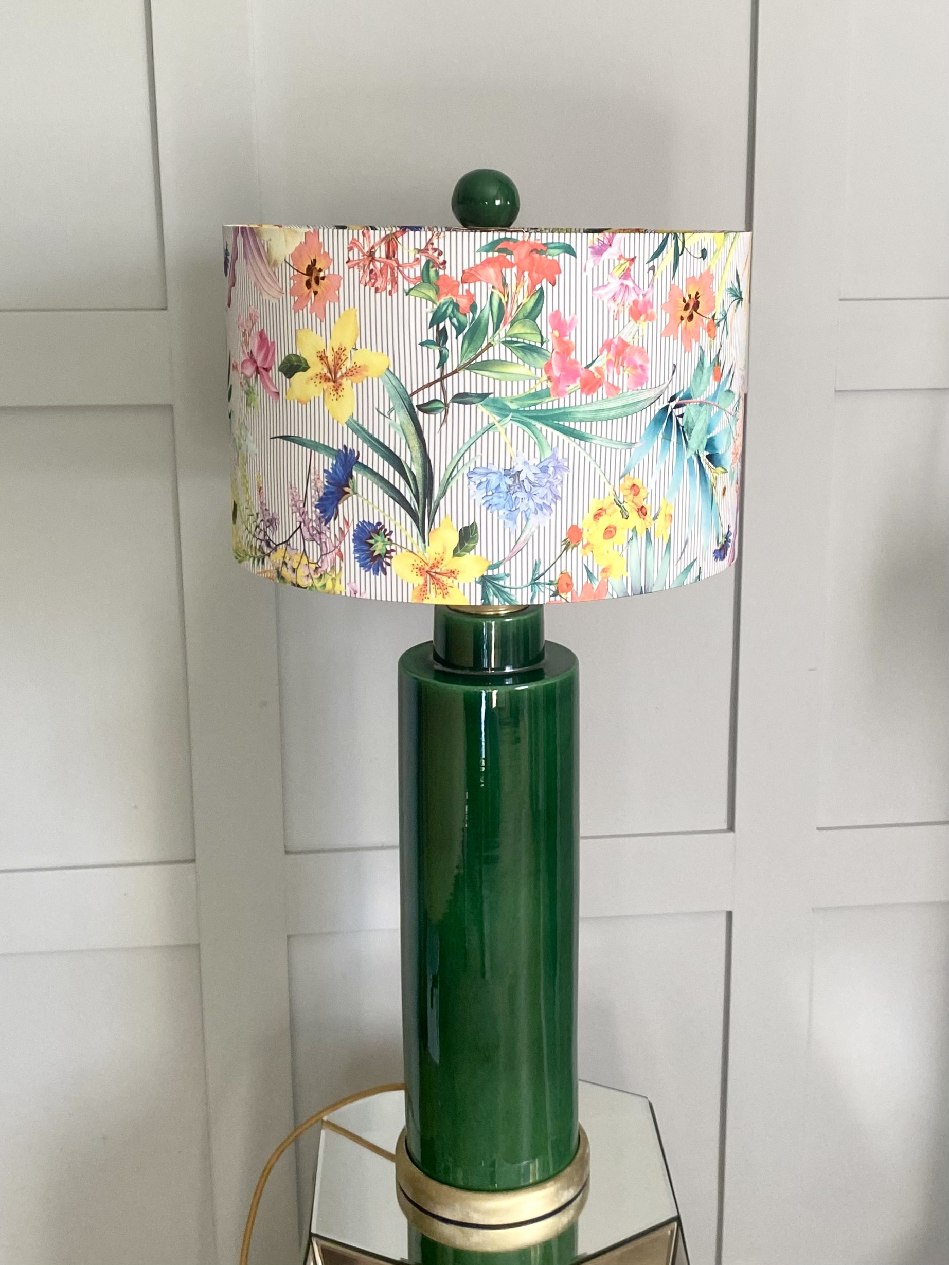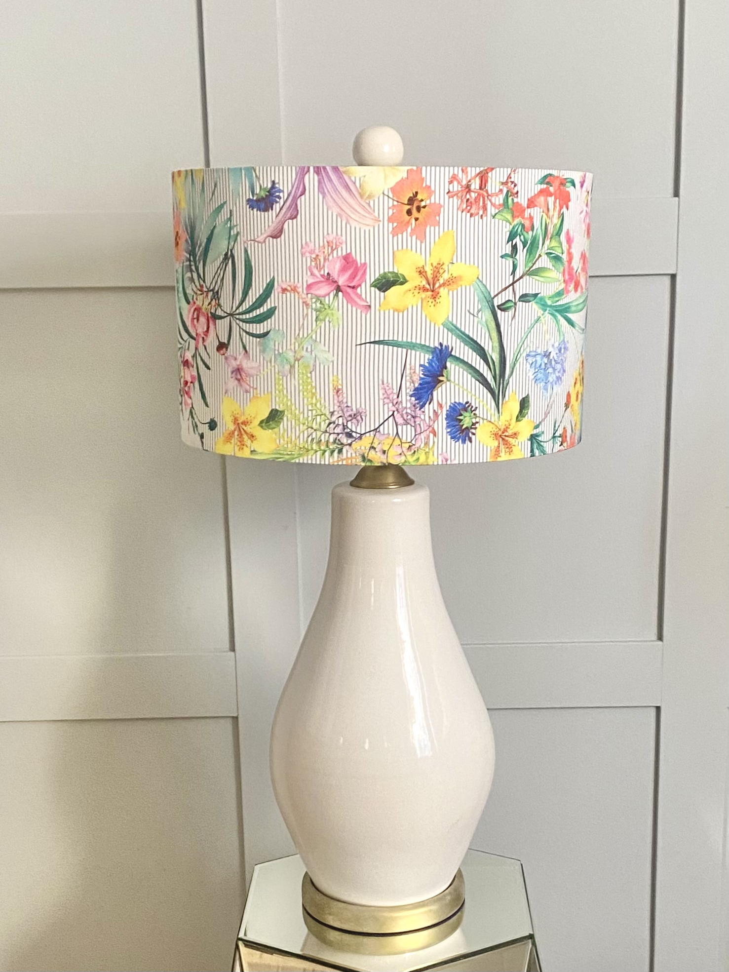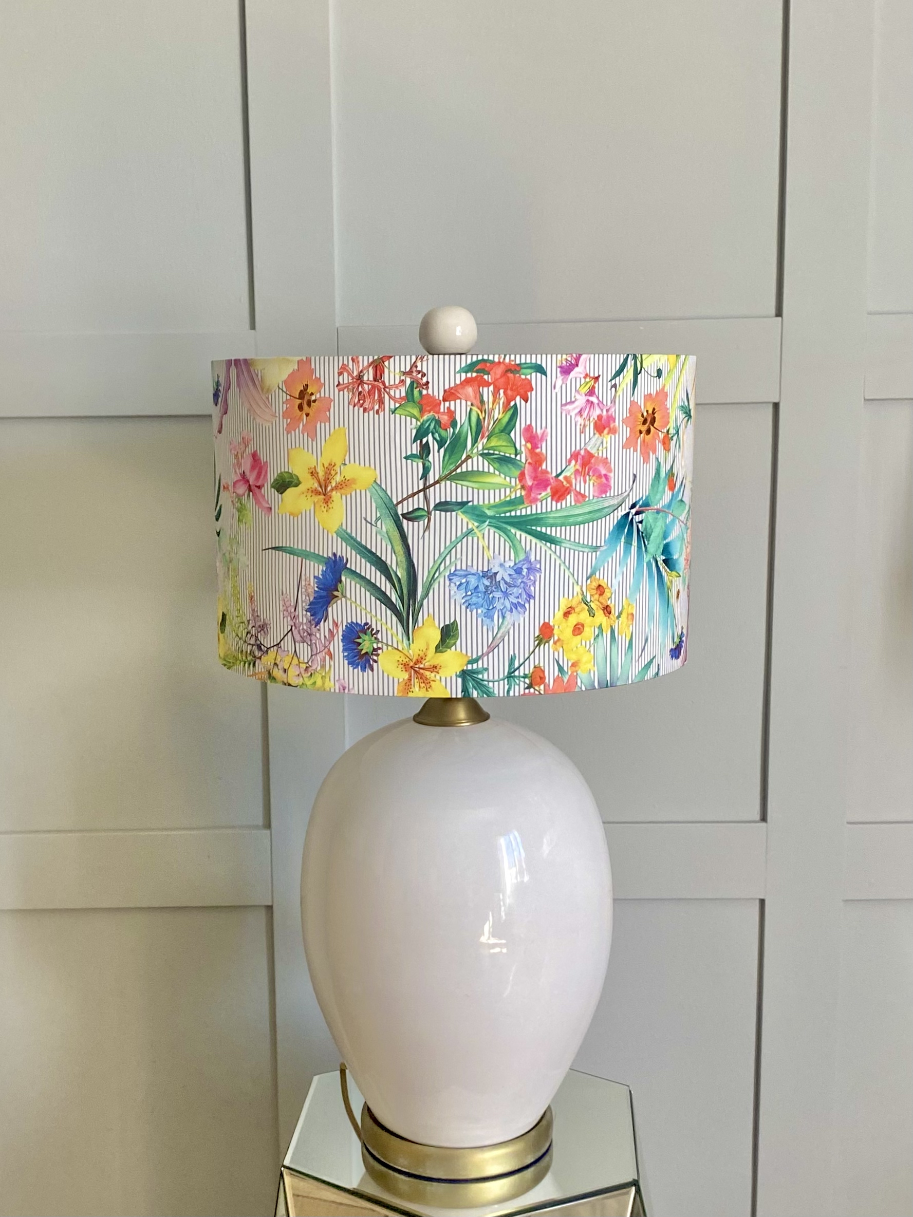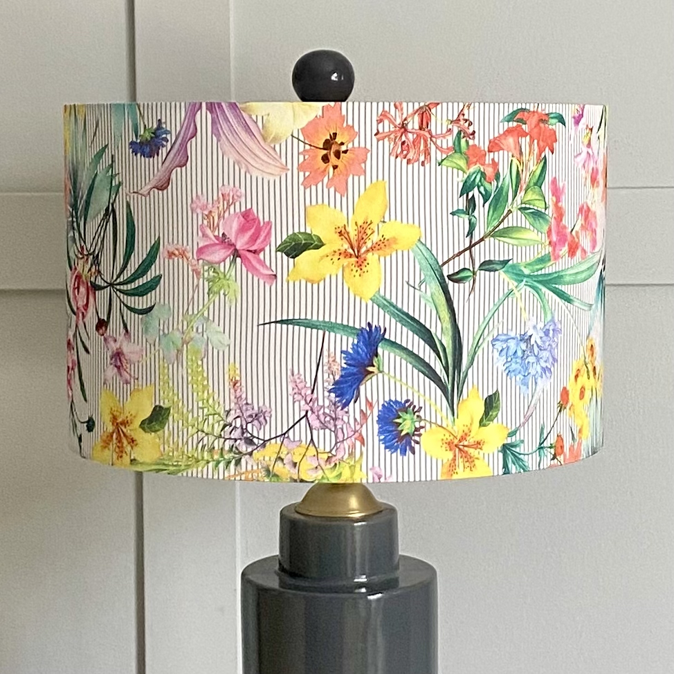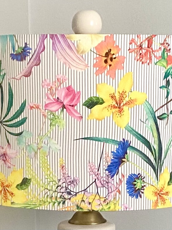 La pantalla Flores y Rayas une dos motivos clásicos en una composición llena de encanto. La suavidad de las flores y la claridad de las rayas se complementan para crear una pieza con carácter y estilo propio.