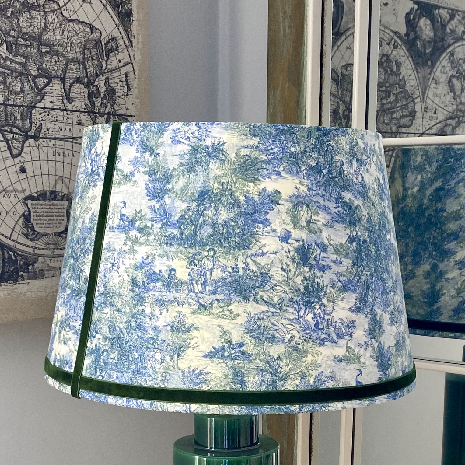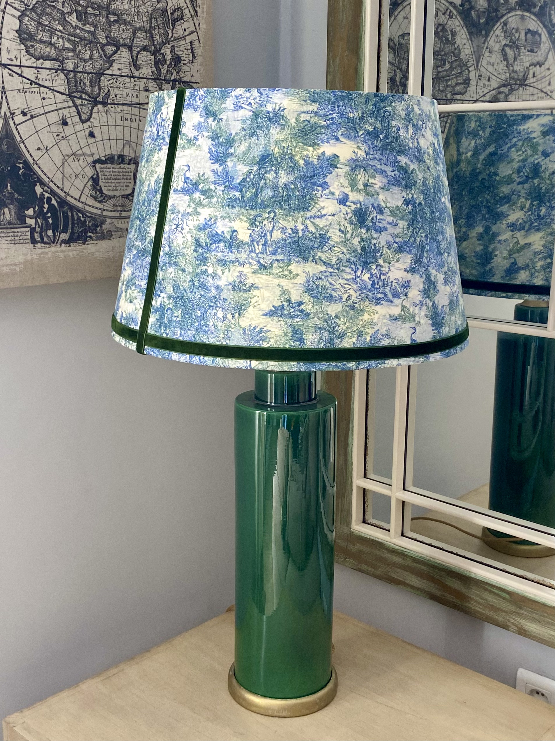 La pantalla Toile de Jouy azul y verde es un guiño atemporal que se integra con sutileza, aportando profundidad y carácter sin alterar la armonía del espacio. Su diseño la convierte en una pieza sofisticada ideal para quienes buscan un estilo sereno con un toque lleno de frescura.