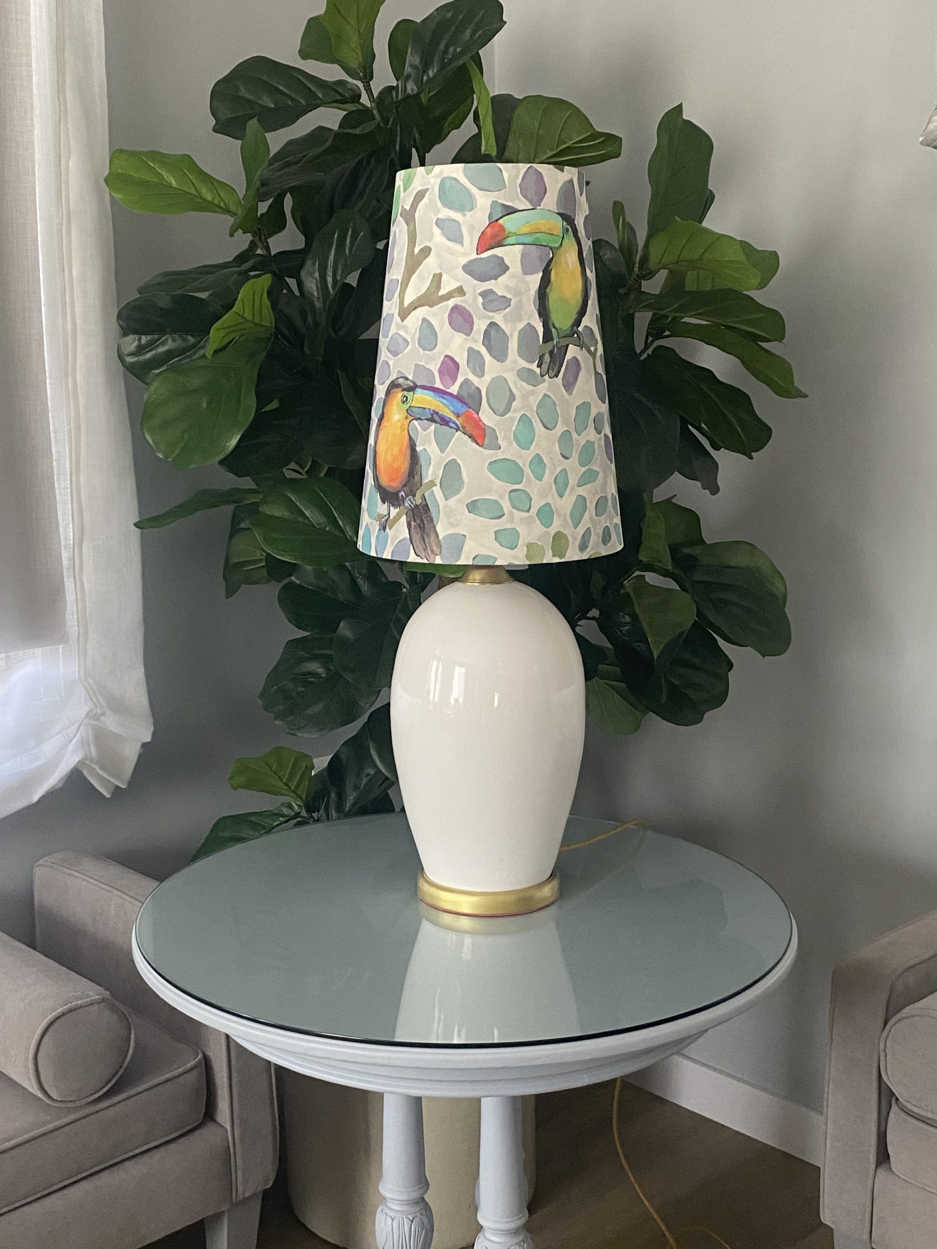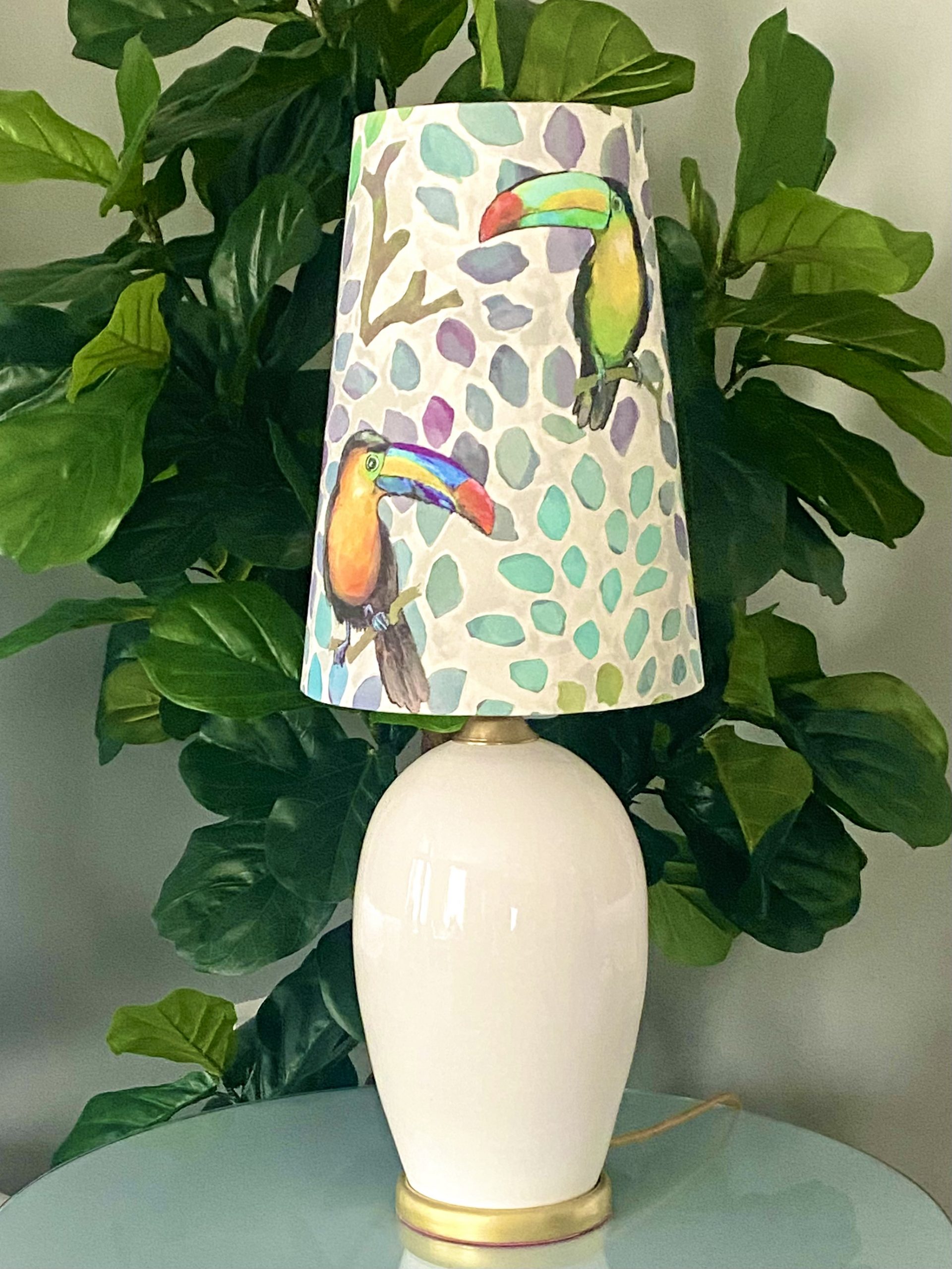 La pantalla Tucanes es una fusión perfecta de colorido y elegancia. Su estampado exótico, lleno de vida, aporta frescura y dinamismo sin perder la armonía y el buen gusto. Una pieza que ilumina no solo con su luz, sino también con su personalidad.